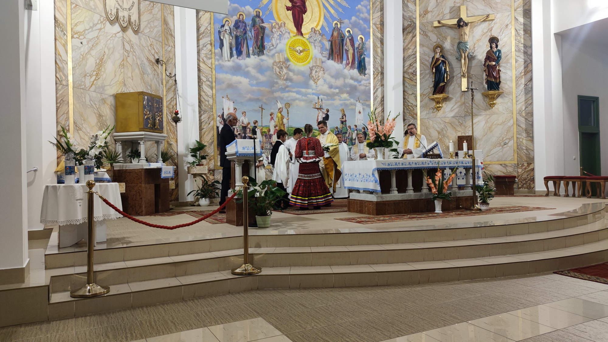 A szentmise elején került sor az üvegablakok ünnepélyes megszentelésére. A templomba belépve bal oldalon ószövetségi szentek: Ábrahám, Mózes, Dávid király és Illés látható, míg jobb oldalon a négy evangélista: Máté, Márk, Lukács és János.